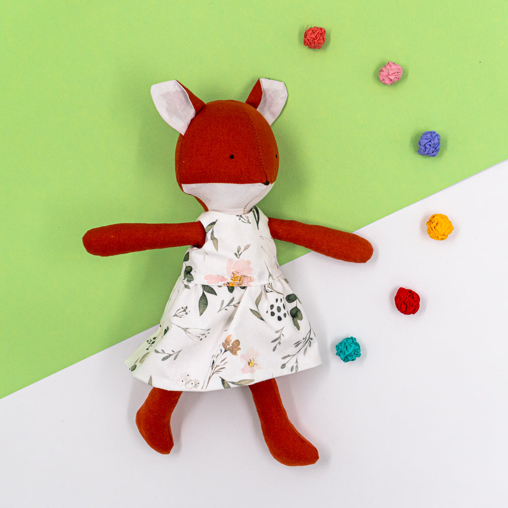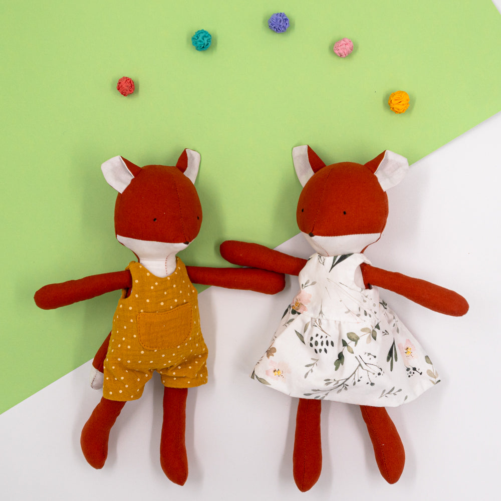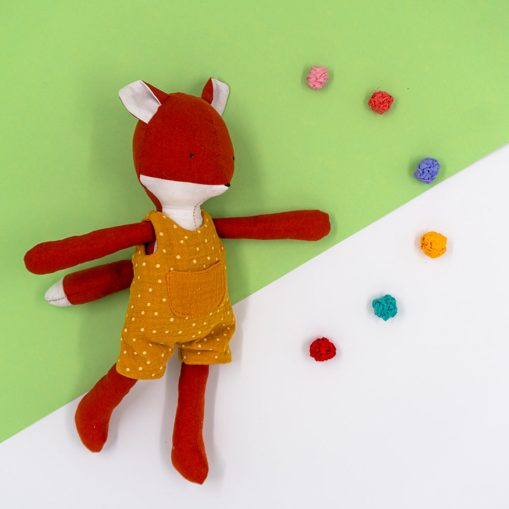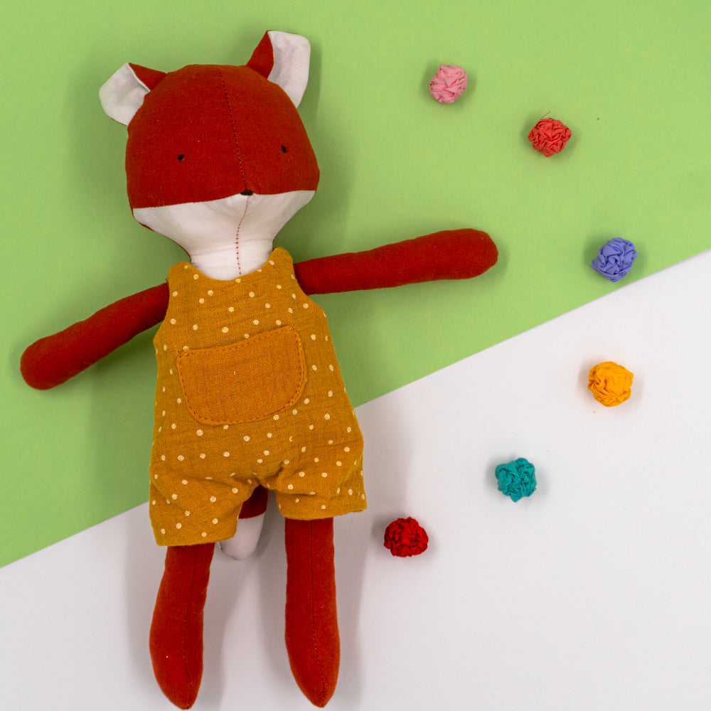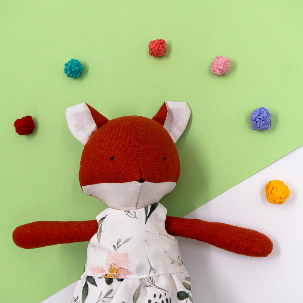 Χειροποίητο παιχνίδι αλεπού, φτιαγμένο από βαμβακερά υφάσματα, με ρουχαλάκια που μπαινοβγαίνουν για πολλές ώρες παιχνιδιού και εξάσκηση της λεπτής κινητικότητας των μικρών παιδιών.