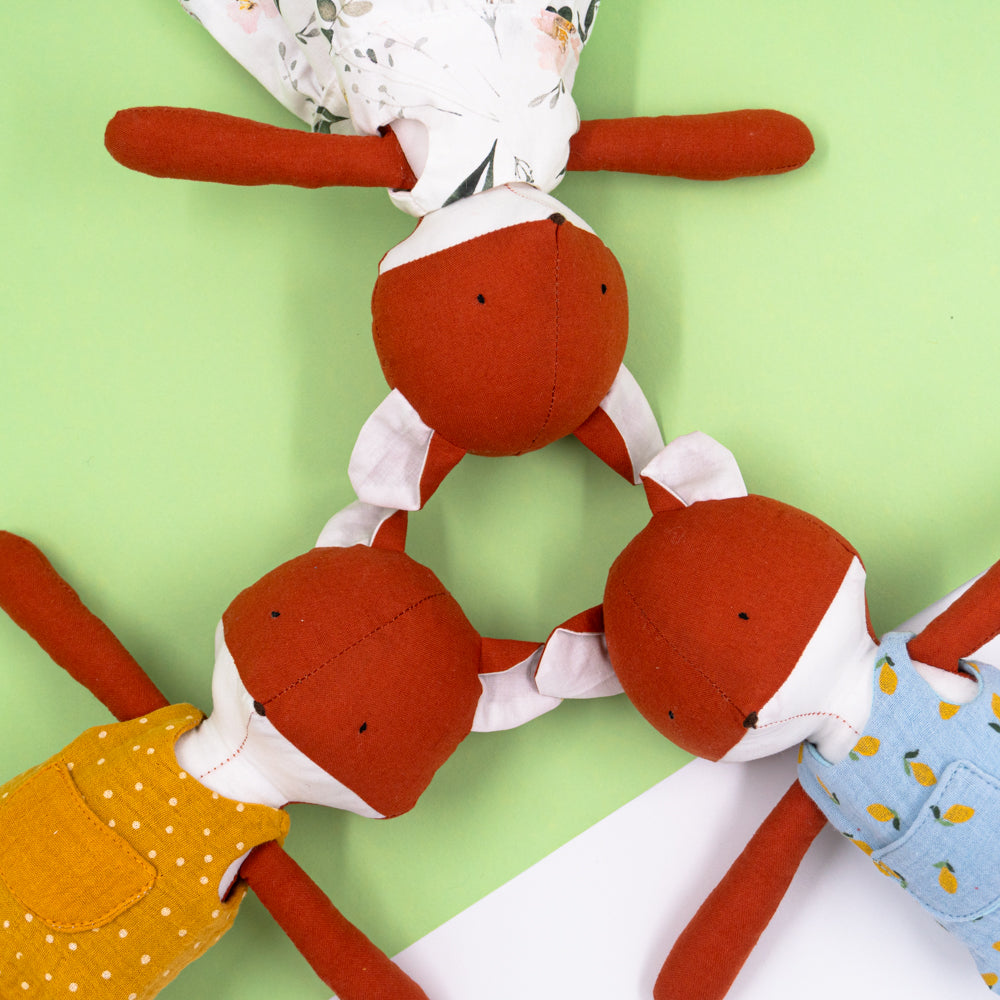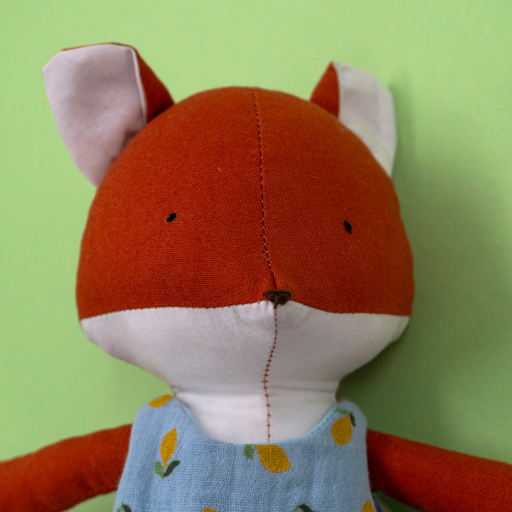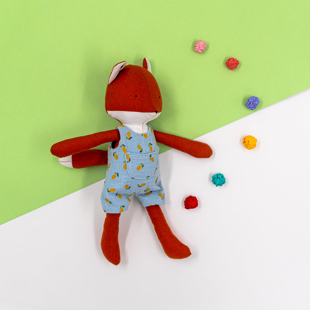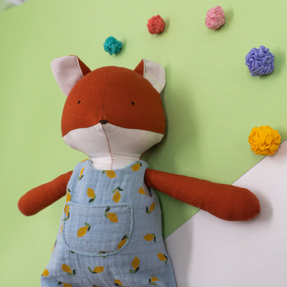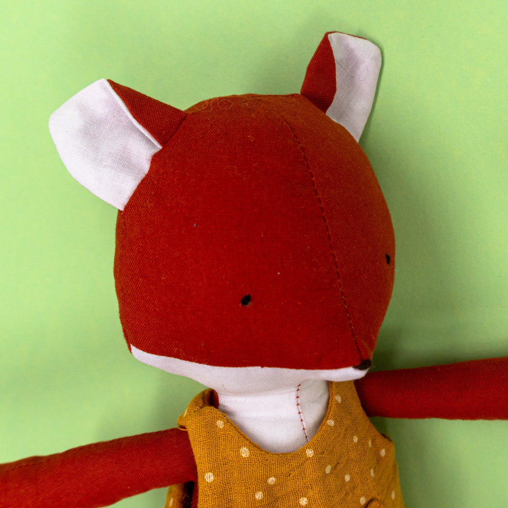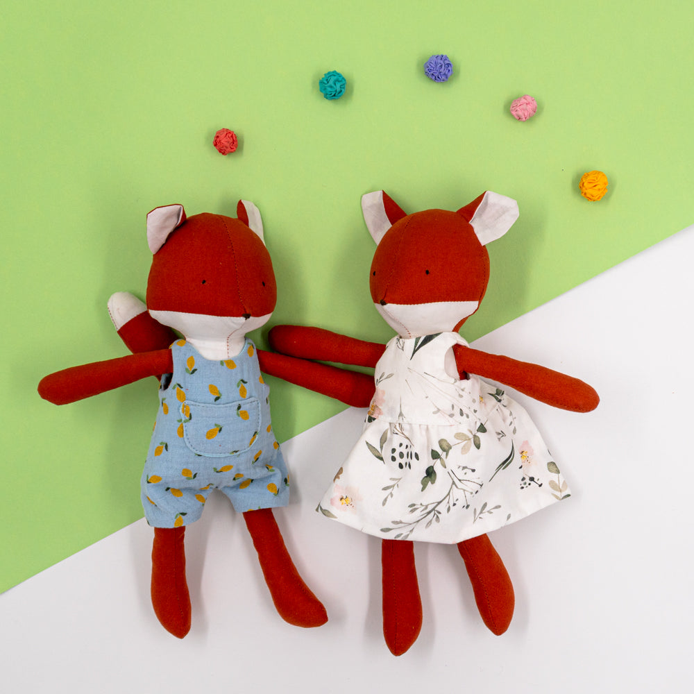 Χειροποίητο παιχνίδι αλεπού, φτιαγμένο από βαμβακερά υφάσματα, με ρουχαλάκια που μπαινοβγαίνουν για πολλές ώρες παιχνιδιού και εξάσκηση της λεπτής κινητικότητας των μικρών παιδιών.