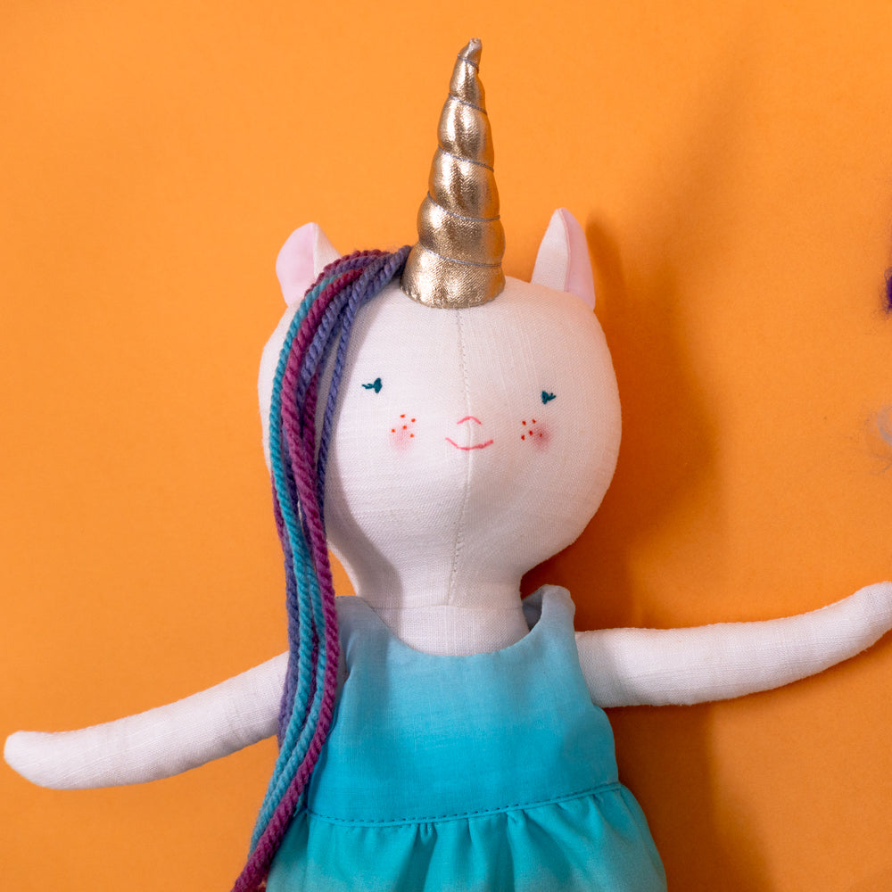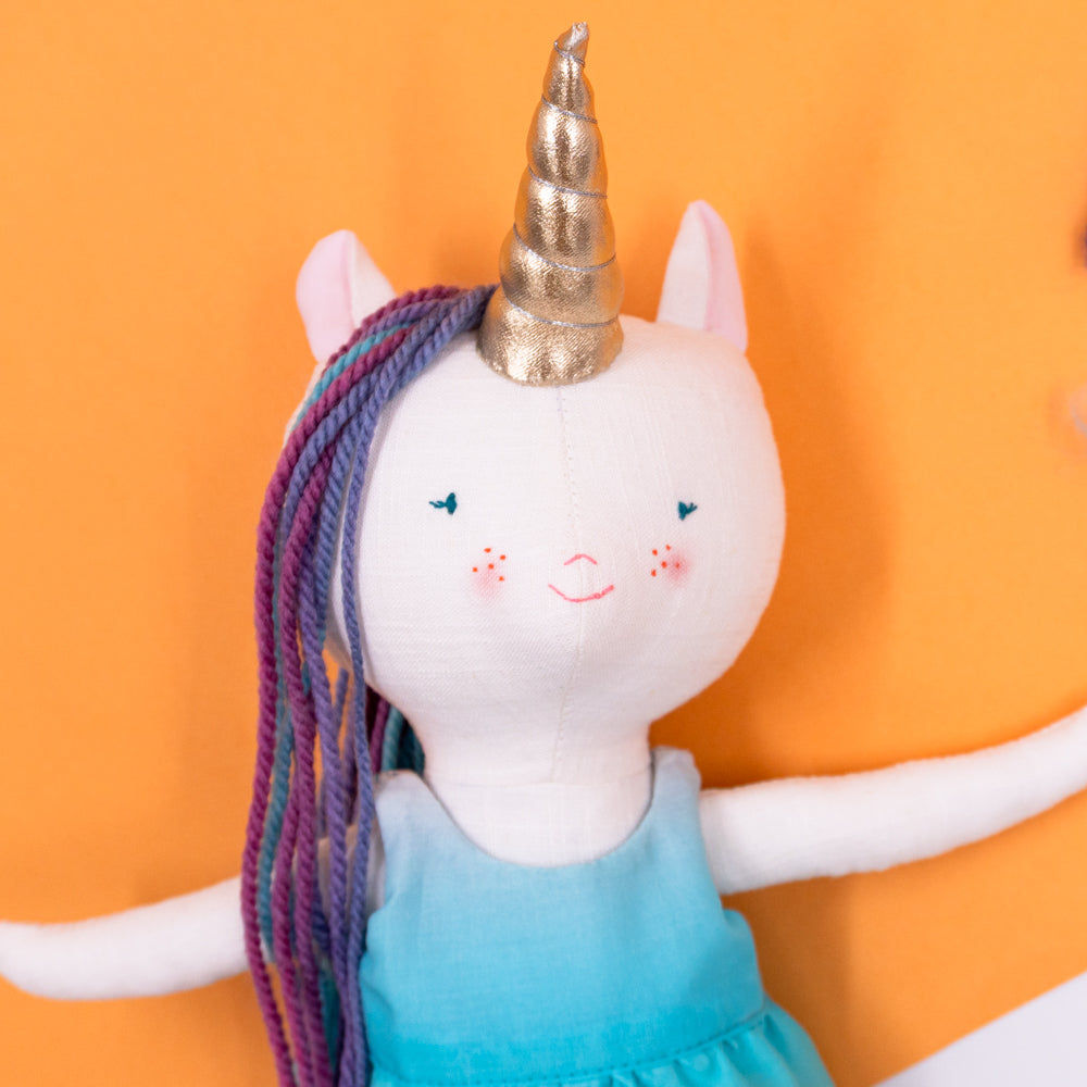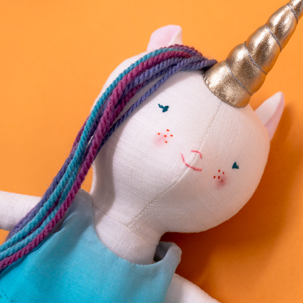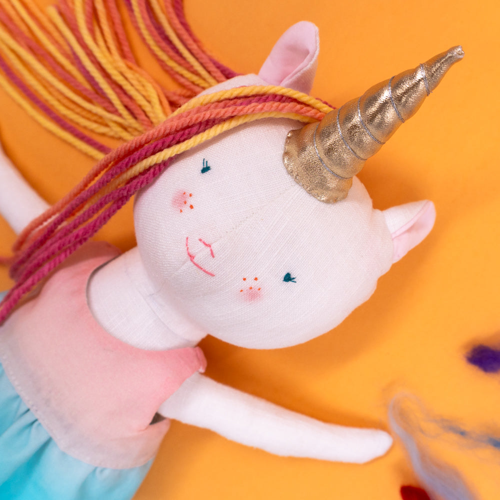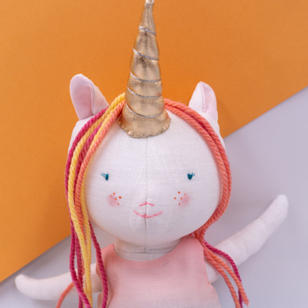 Χειροποίητη κούκλα μονόκερος για ατελείωτες ώρες φανταστικού παιχνιδιού. Φτιαγμένη από βαμβακερά υφάσματα, με ρουχαλάκια που μπαινοβγαίνουν, για την εξάσκηση της λεπτής κινητικότητας των μικρών παιδιών.