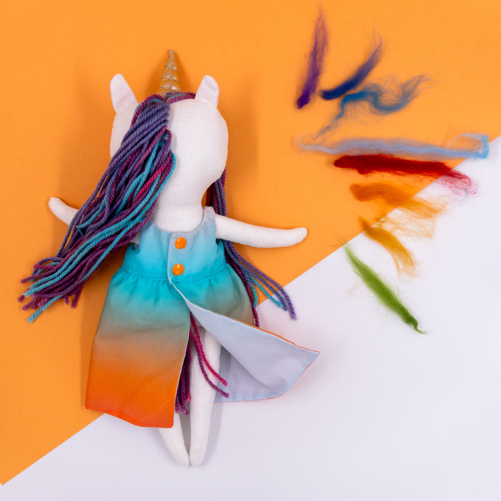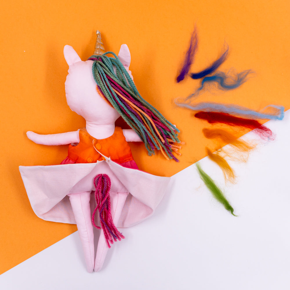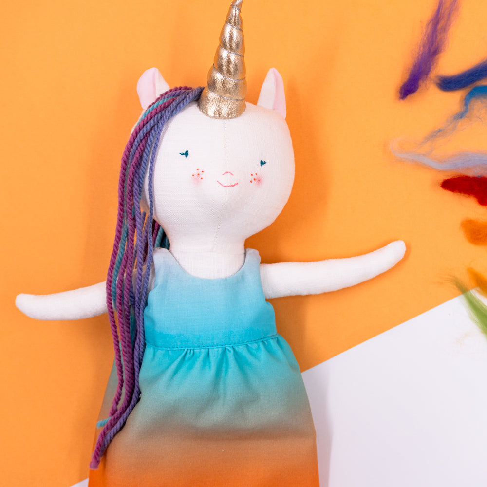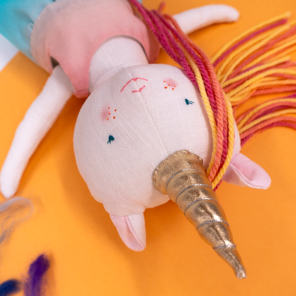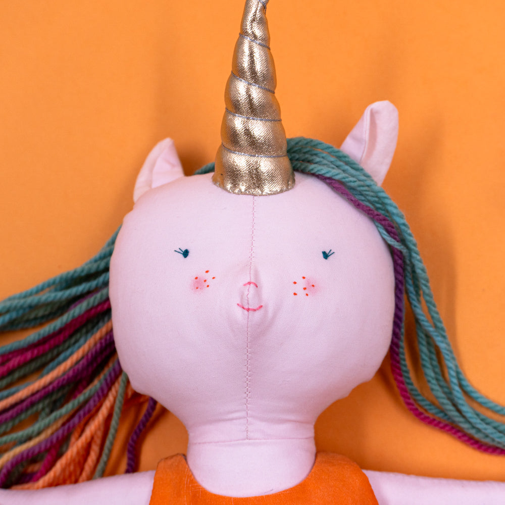 Χειροποίητη κούκλα μονόκερος για ατελείωτες ώρες φανταστικού παιχνιδιού. Φτιαγμένη από βαμβακερά υφάσματα, με ρουχαλάκια που μπαινοβγαίνουν, για την εξάσκηση της λεπτής κινητικότητας των μικρών παιδιών.