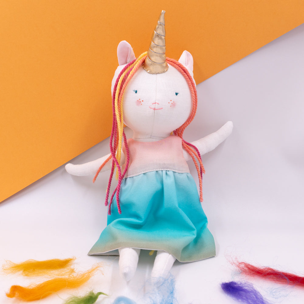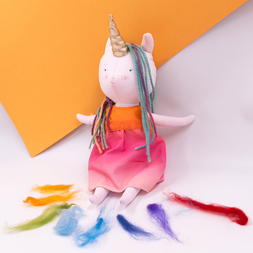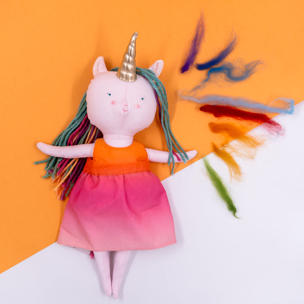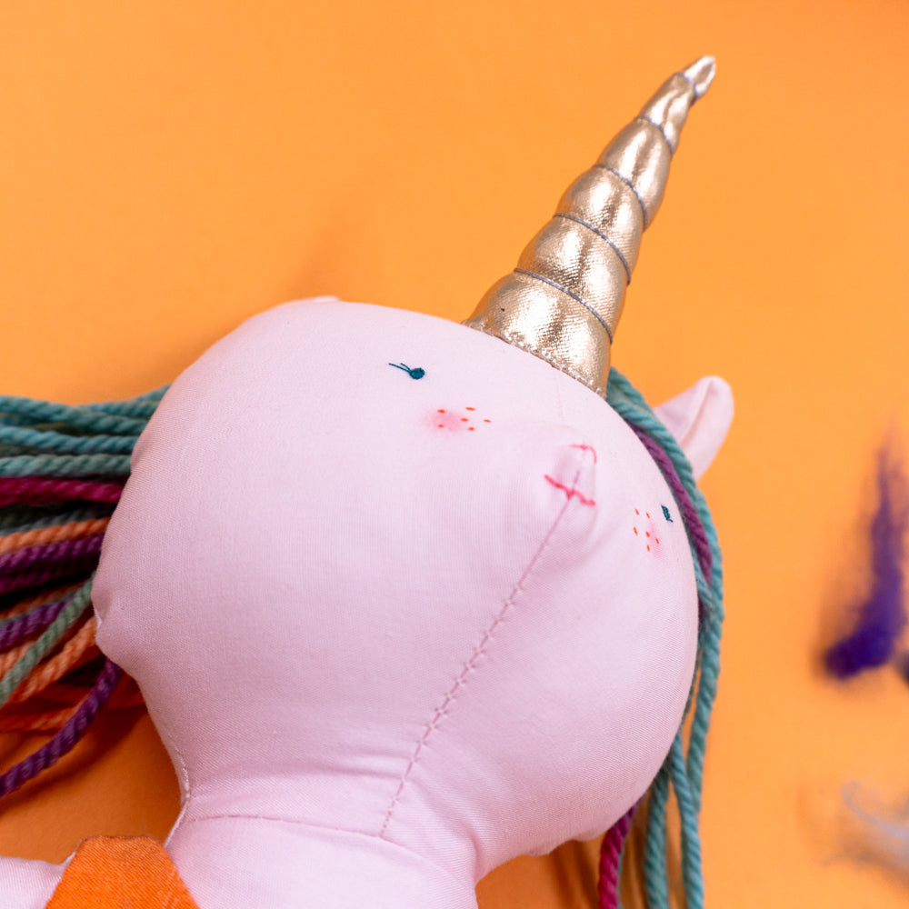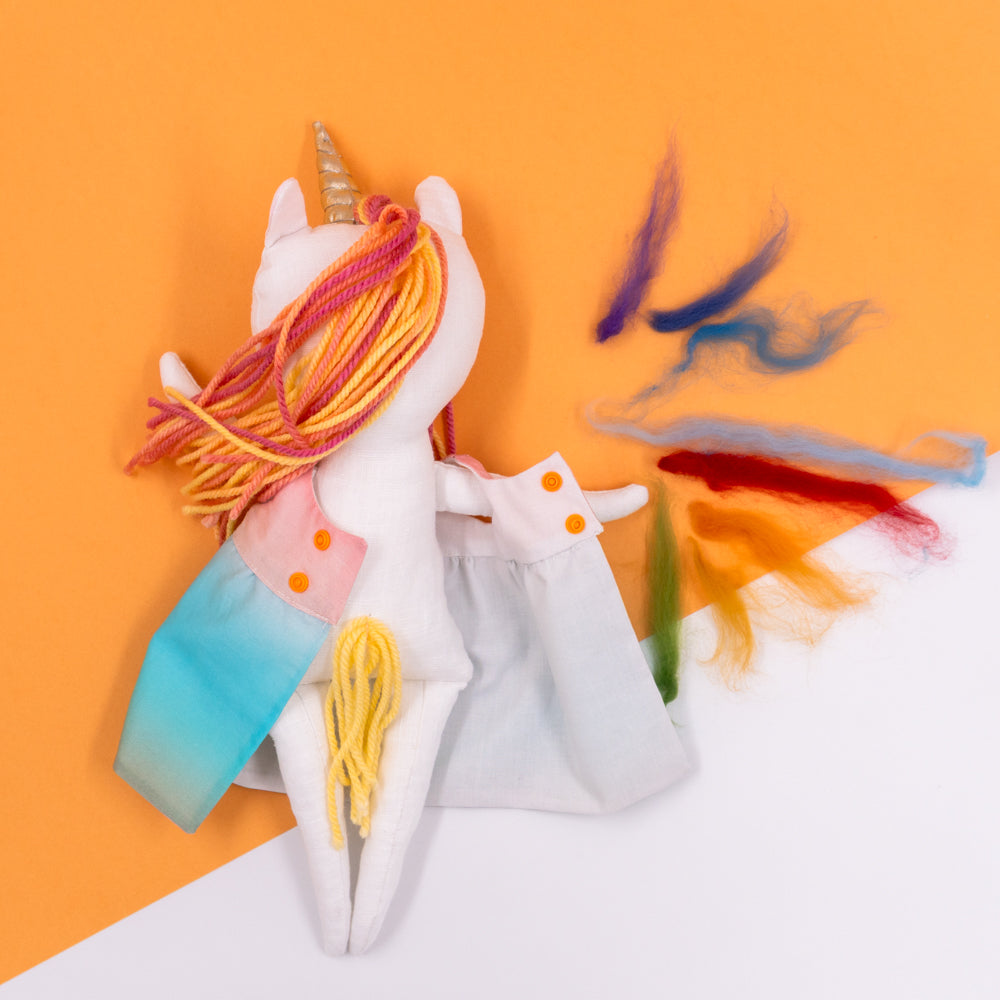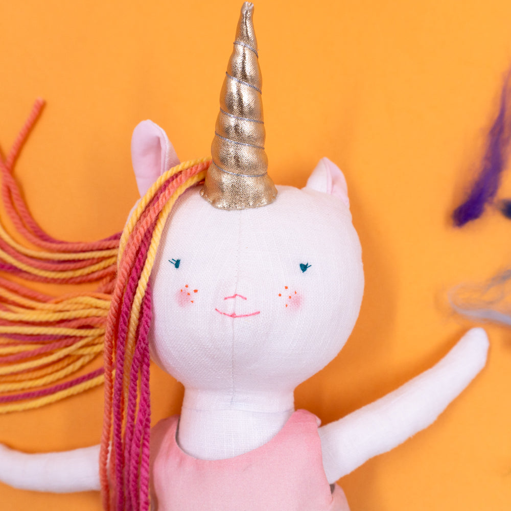 Χειροποίητη κούκλα μονόκερος για ατελείωτες ώρες φανταστικού παιχνιδιού. Φτιαγμένη από βαμβακερά υφάσματα, με ρουχαλάκια που μπαινοβγαίνουν, για την εξάσκηση της λεπτής κινητικότητας των μικρών παιδιών.
