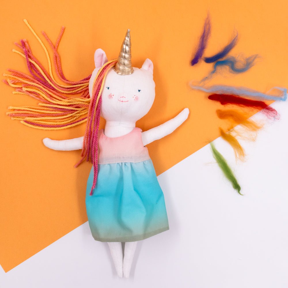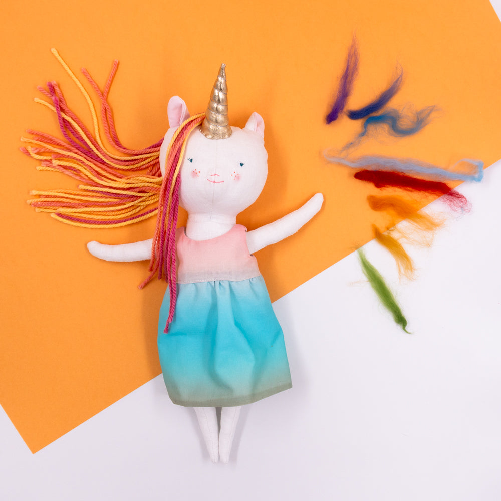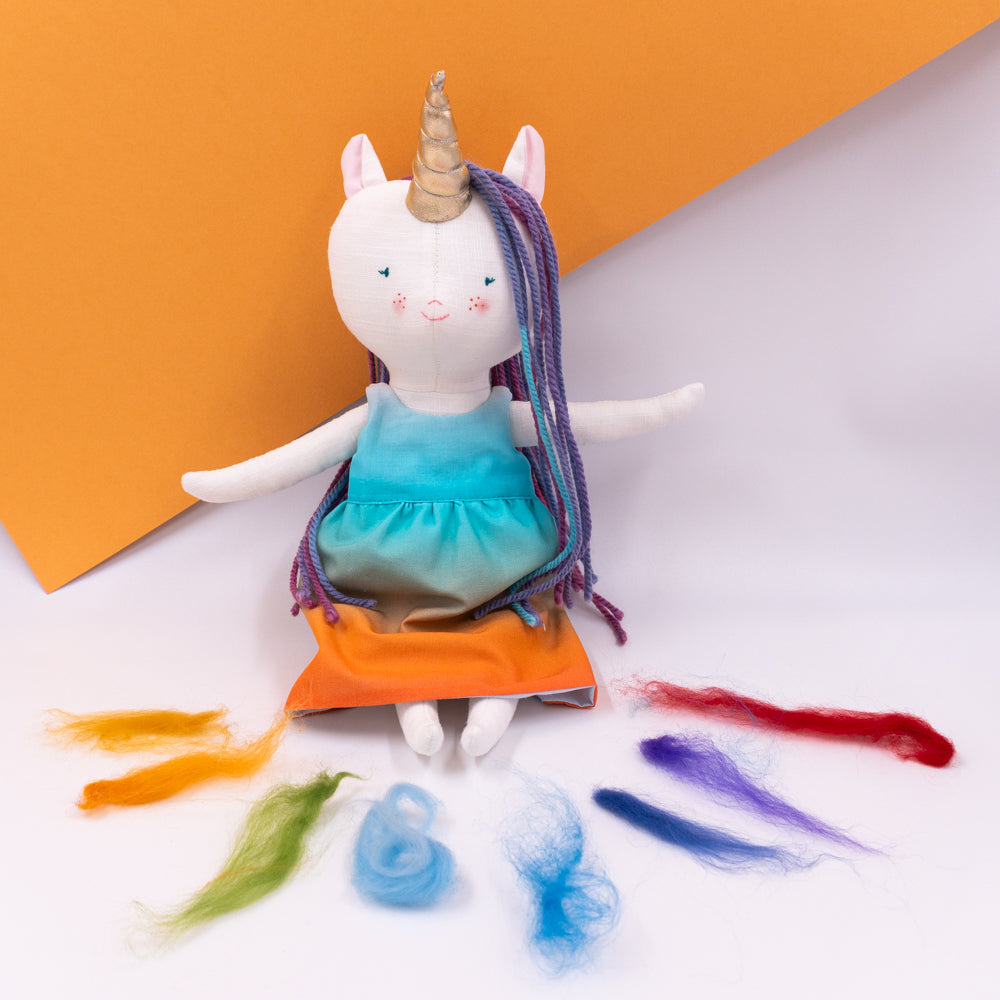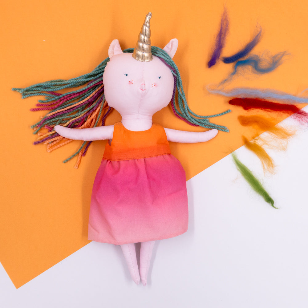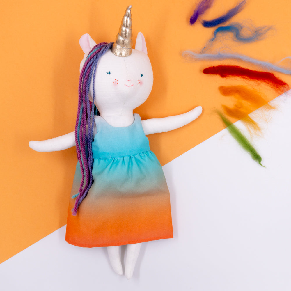 Χειροποίητη κούκλα μονόκερος για ατελείωτες ώρες φανταστικού παιχνιδιού. Φτιαγμένη από βαμβακερά υφάσματα, με ρουχαλάκια που μπαινοβγαίνουν, για την εξάσκηση της λεπτής κινητικότητας των μικρών παιδιών.