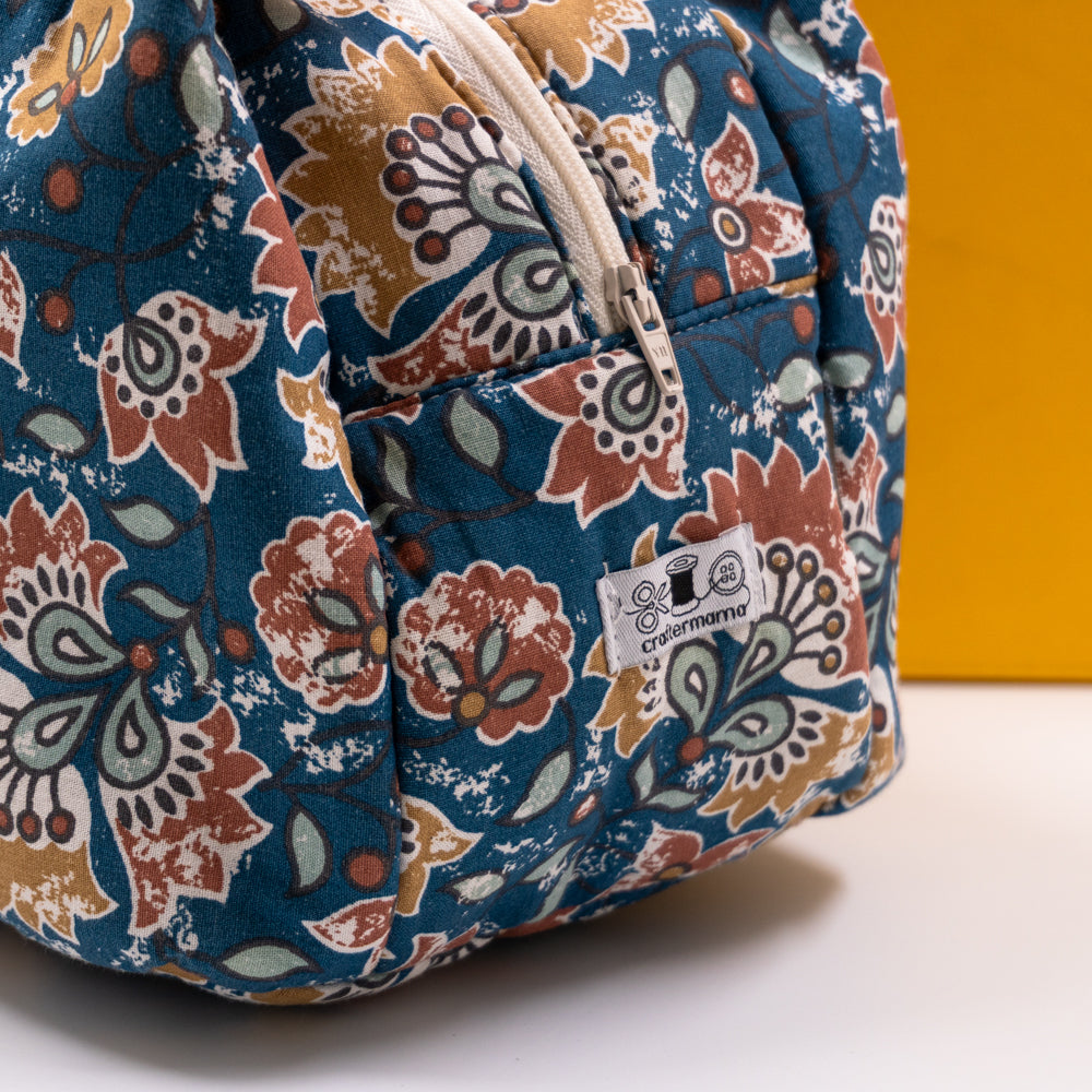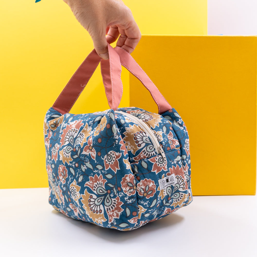 Τσαντάκι φαγητού με χερούλια και φερμουάρ, μπλε με λουλούδια