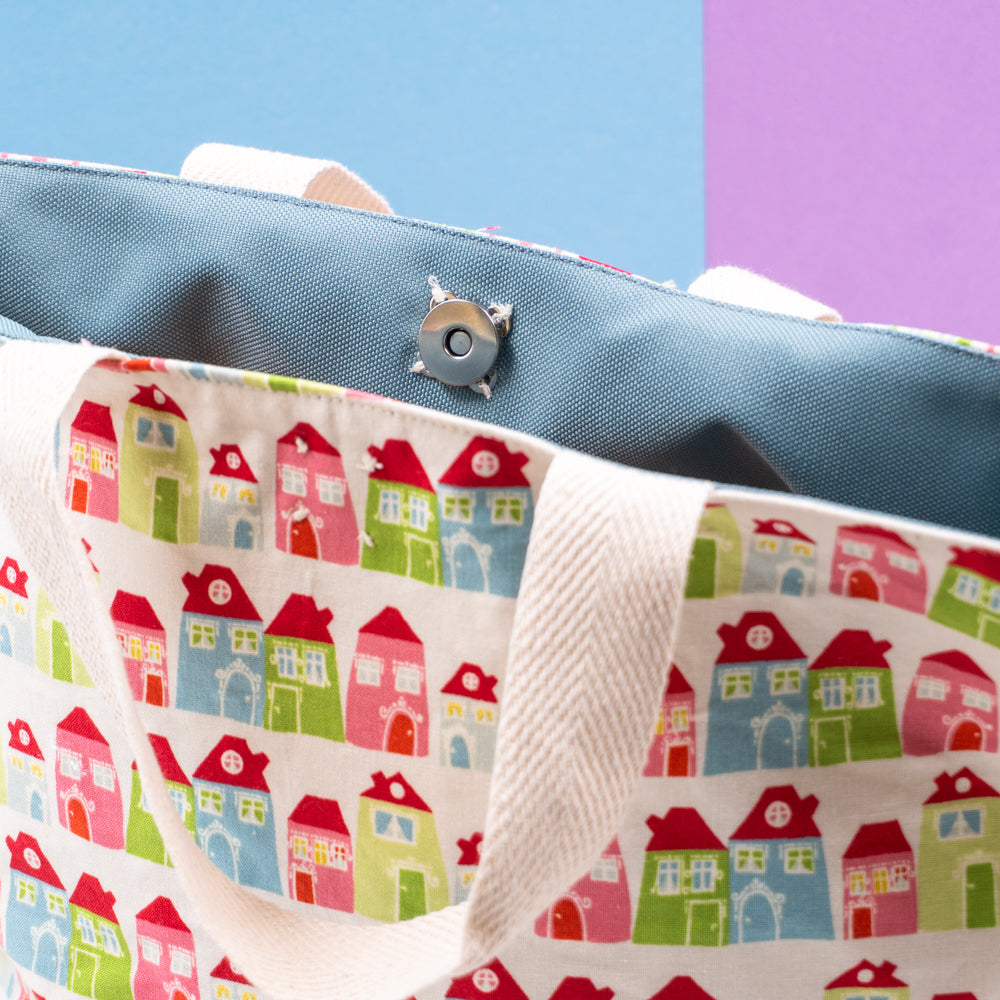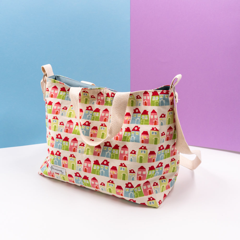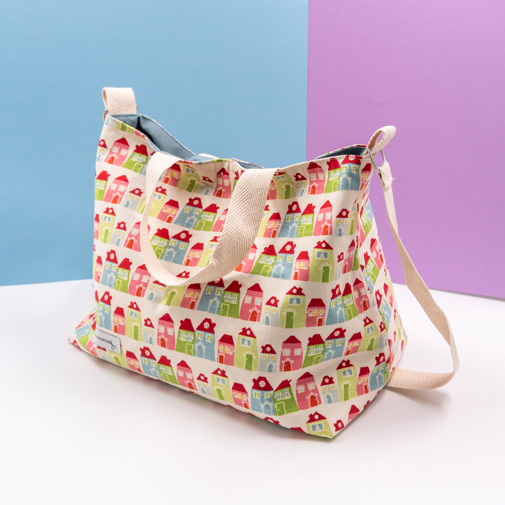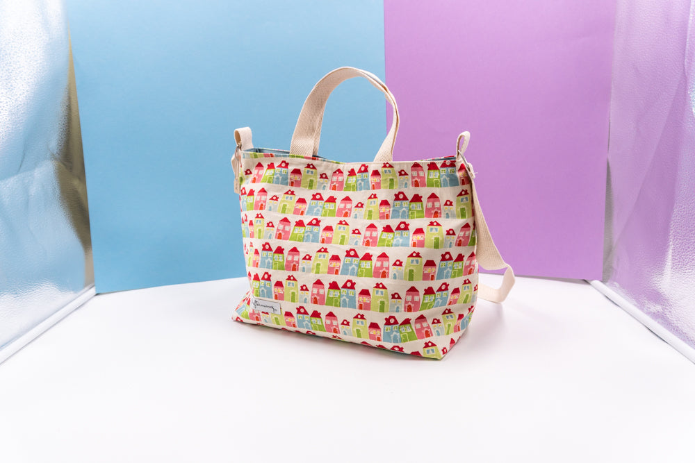 Τσάντα φαγητού με ιμάντα, χερούλια και μαγνητικό κούμπωμα, σε εκρού με σπιτάκια